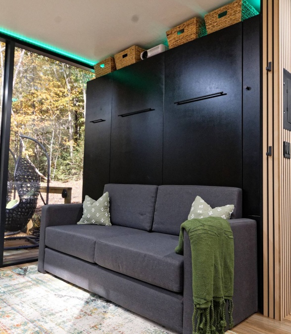 The mirror house is organized as a studio space with the living room doubling as a bedroom and uses a creative Murphy wall bed. This makes the space feel far bigger, as do the windows on nearly all sides of you. However, the bathroom itself is small, leaving minimal storage space for your things. The mirrors are coated with a special patented anti-bird strike technology inside to prevent birds from not seeing the structure. To date, we have never had a bird strike.