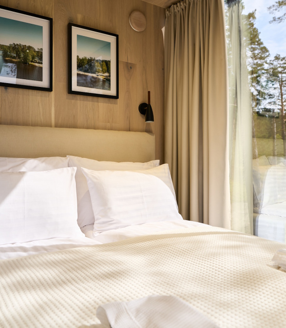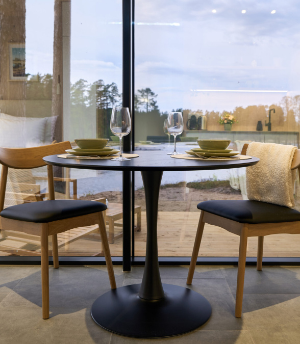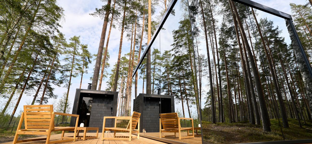 Inside the mirror sauna, designed with glass walls that open up to the surrounding landscape, you can unwind in comforting warmth while enjoying the peaceful views of nature—creating a moment of deep relaxation and connection with the environment.
