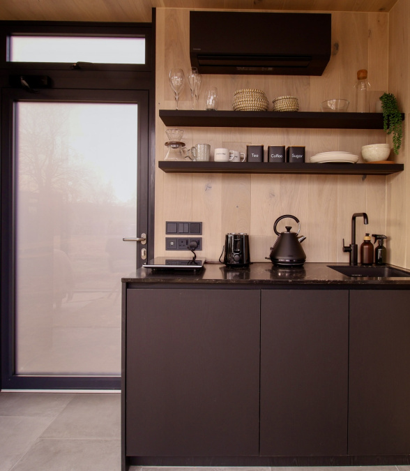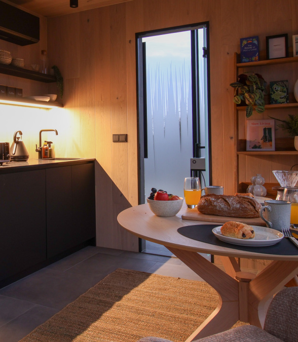 The cabin features a king-size bed, air conditioning and underfloor heating, and a compact kitchenette with a one ring hob, suited to light meals and relaxed dining — with the barbecue ideal for evening cooking.