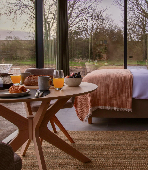 Cranc is a beautifully considered mirrored cabin designed for privacy, calm, and understated luxury, set within the Anglesey countryside. Its mirrored exterior reflects the surrounding landscape, creating a strong sense of seclusion, while inside you’ll find a warm, minimalist interior.