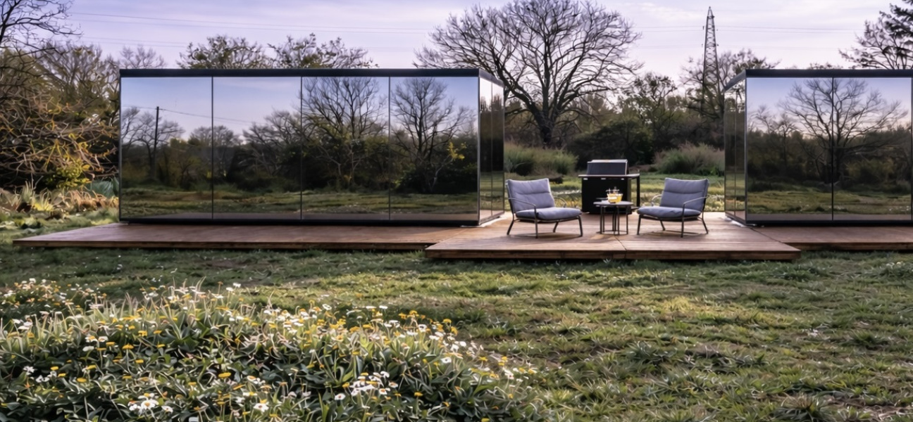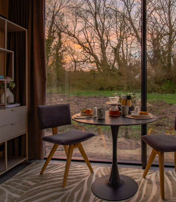 Palôd is a refined, design-forward cabin offering complete seclusion and understated comfort, set within the Anglesey countryside. Its mirrored exterior reflects the surrounding landscape, while inside the space feels warm, calm, and thoughtfully composed.
