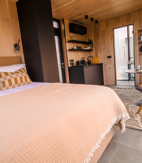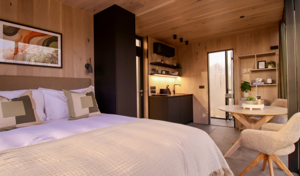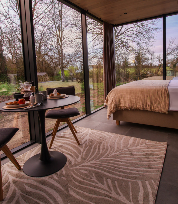 The cabin features a king-size bed, air conditioning and underfloor heating, and a compact kitchenette with one ring hob, the space is best suited to light meals, leisurely breakfasts, and relaxed, unfussy dining — with the barbecue ideal for evening cooking.