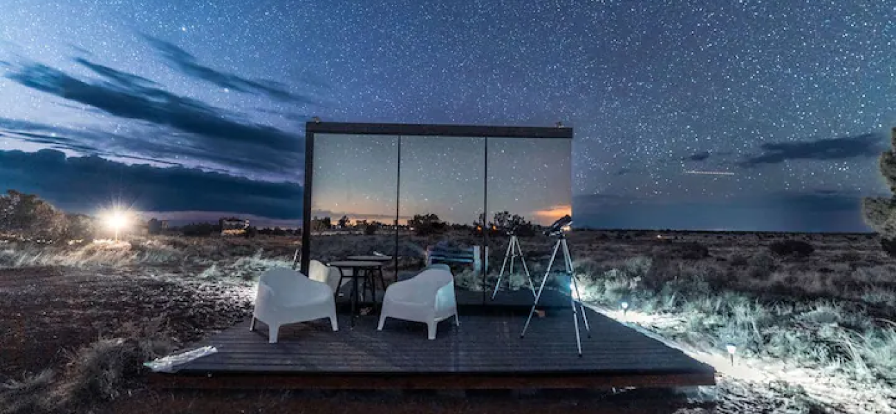 Starry Nights Glamping site is conveniently situated just a 30-minute drive from the entrance to the Grand Canyon. These four unique 100 sqft Mirror cabins harmoniously integrate with their natural environment, providing guests with an unmatched retreat featuring stunning views of the sky, ideal for stargazing. The entire property operates off-grid, powered by solar energy, ensuring that nature remains the focal point.