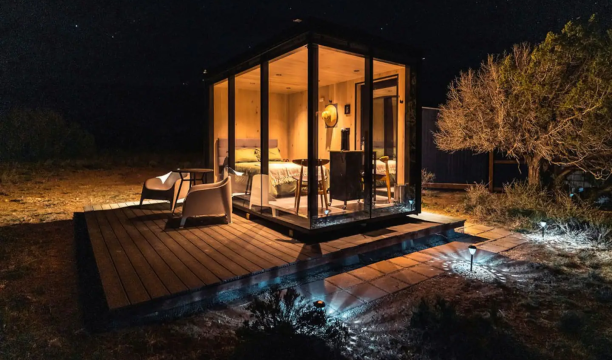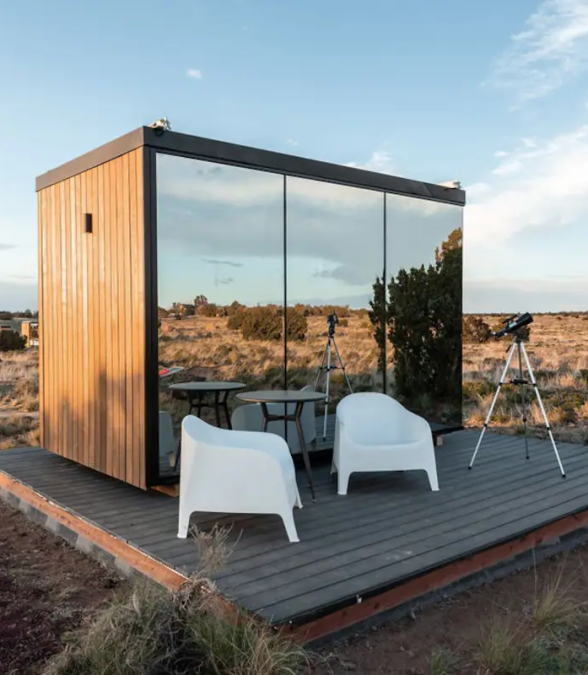 Starry Nights Glamping site is conveniently situated just a 30-minute drive from the entrance to the Grand Canyon. These four unique 100 sqft Mirror cabins harmoniously integrate with their natural environment, providing guests with an unmatched retreat featuring stunning views of the sky, ideal for stargazing. The entire property operates off-grid, powered by solar energy, ensuring that nature remains the focal point.
