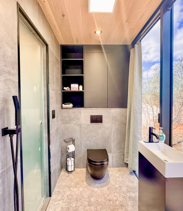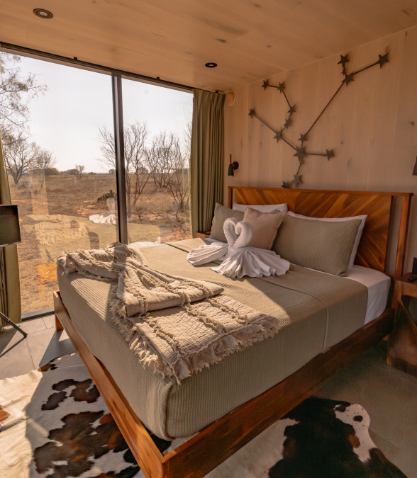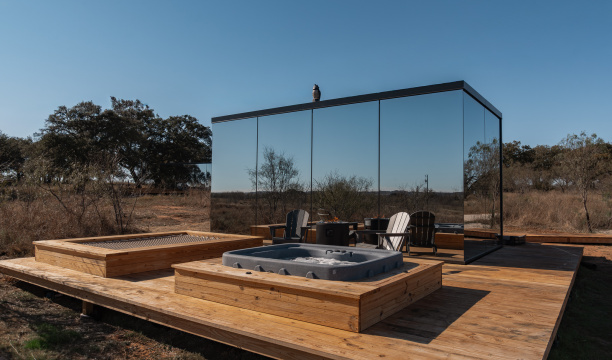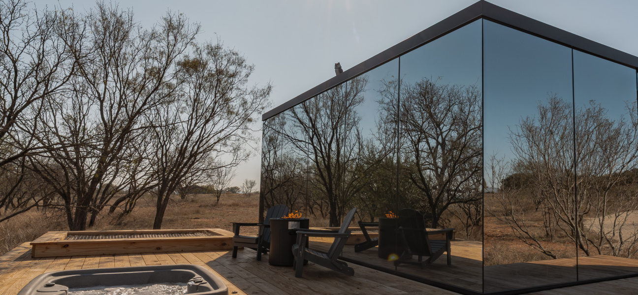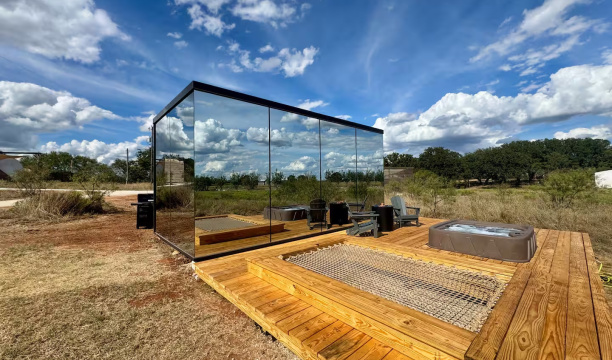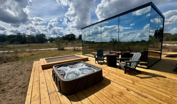 Escape to Andromeda, a stunning ÖÖD Mirror House set against the lush vineyards of Michael Ros Winery, just five minutes from downtown Fredericksburg. Wrapped in reflective glass, this private retreat dissolves into the landscape, offering both modern elegance and a deep connection to nature.Inside, enjoy the comfort of a king bed, a fully equipped kitchenette, a dining area, Wi-Fi, and a cozy space for evenings in.