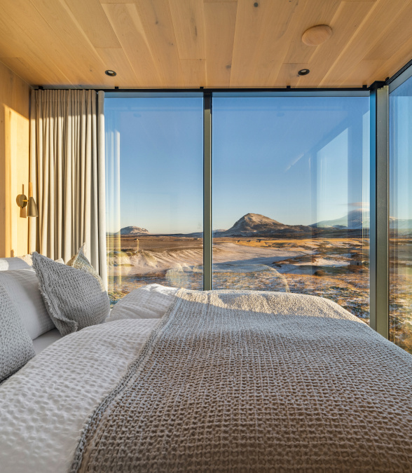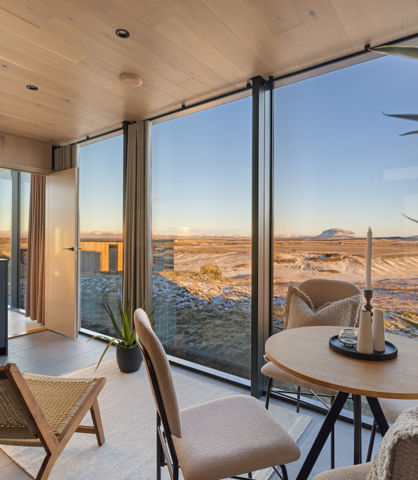 Ideal for groups of friends, couples, or families, Glacier House at ÖÖD Hekla Horizon offers two bedrooms, a private sauna, and stunning views of Mount Hekla, the volcanic landscape, and the Selsundslækur river. From your private patio, gaze out at the magnificent scenery and immerse yourself in the peaceful surroundings. This spacious retreat also features a cozy living area, kitchenette, and access to the Northern Light Lounge, providing the perfect space to relax after a day of exploring Iceland's natural wonders.
